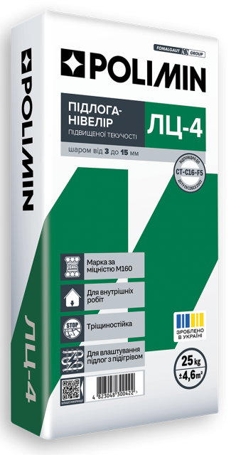 Polimin LC-4 (Підлога-Нівелір) — це високоякісна самовирівнювальна суміш на основі гідравлічних в’яжучих, призначена для підготовки поверхонь підлоги перед укладанням фінішних покриттів (плитки, ламінату, лінолеуму, ковроліну).