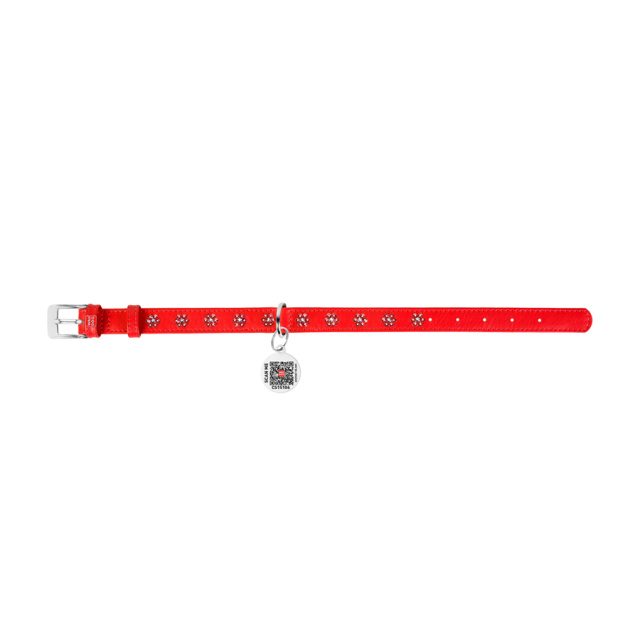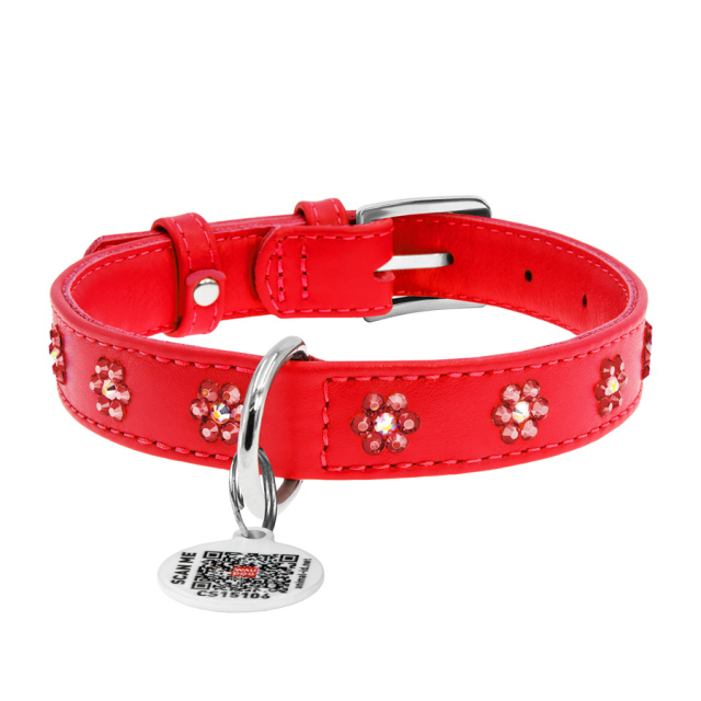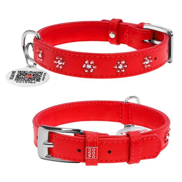 Нашийник для собак шкіряний WAUDOG Glamour з QR паспортом, з клейовими стразами «Квіти», Ш 15 мм, Дов 27-36 см червоний, Львів