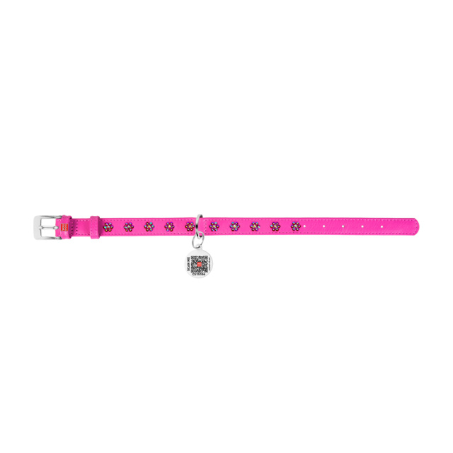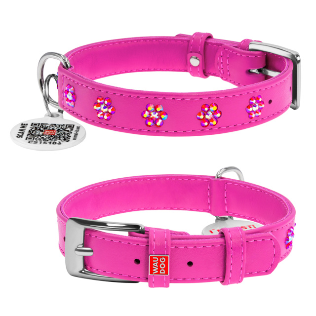 Нашийник для собак шкіряний WAUDOG Glamour з QR паспортом, з клейовими стразами «Квіти», Ш 15 мм, Дов 27-36 см рожевий, Львів