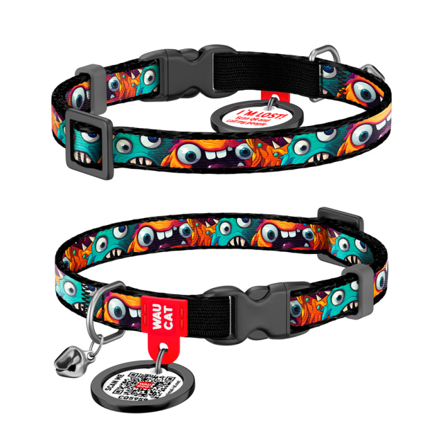 Нашийник для котів нейлоновий WAUCAT Nylon з QR паспортом, малюнок «Зубасті монстри», пластиковий фастекс, XS, Ш 10 мм, Дов 20-30 см, Львів