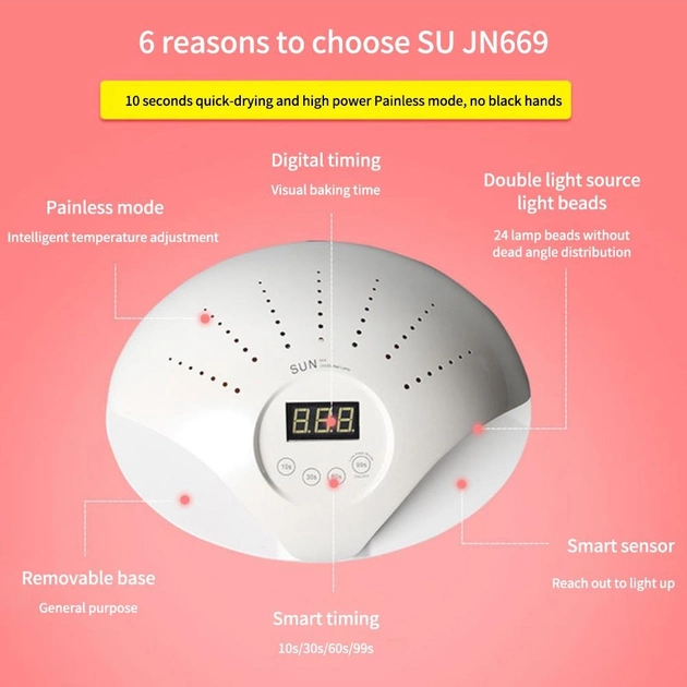 Лампа Beauty nail Sun 669-48WT LED+UV – цей інноваційний прилад зі стильним та ефективним дизайном та стратегічно розміщеним світлодіодами забезпечує швидке та якісне сушіння нігтів. Чотири налаштування таймера дозволяють вибрати інший час відповідно до типів гелів для нігтів, щоб покращити якість ваших нігтів.